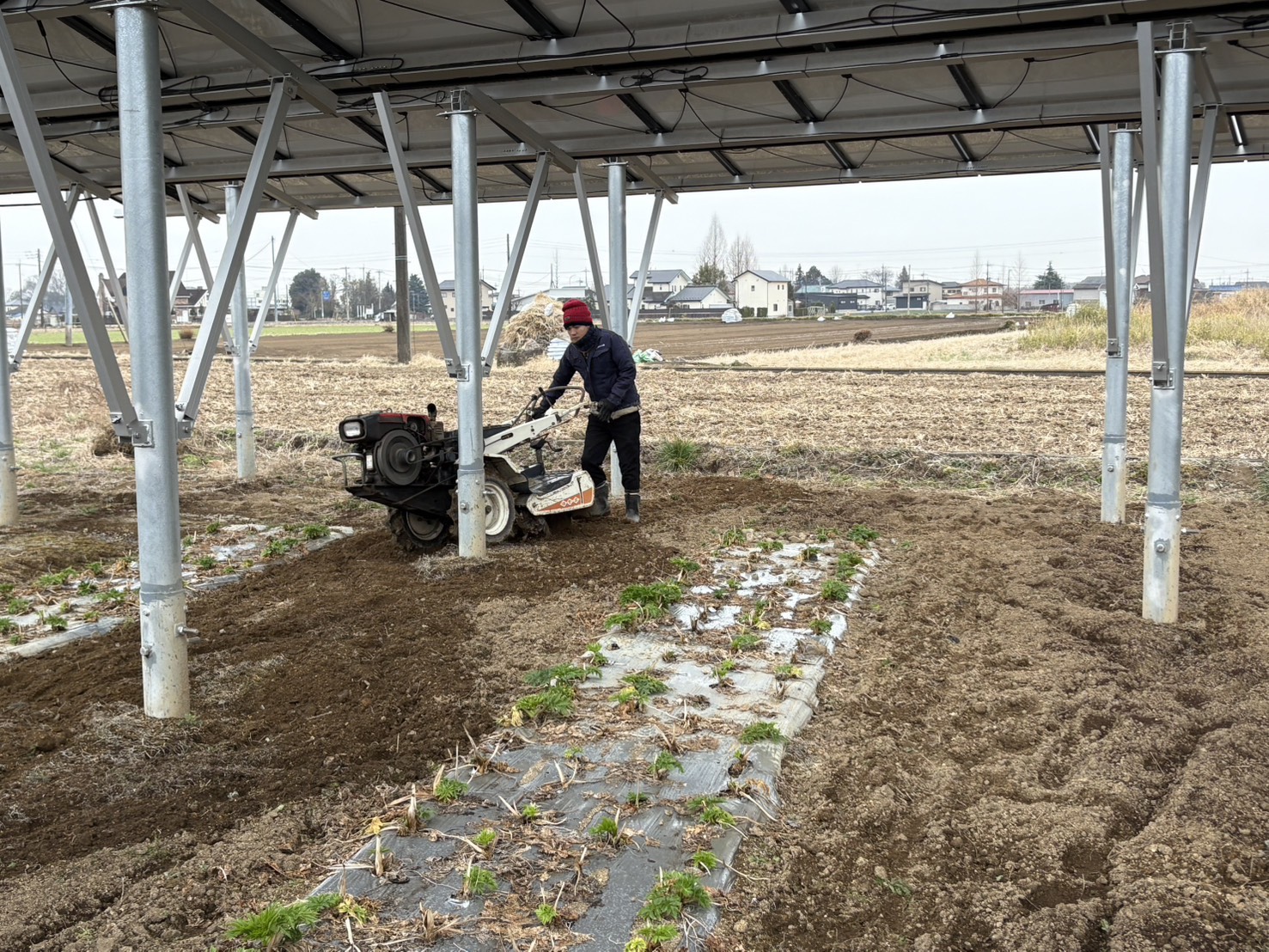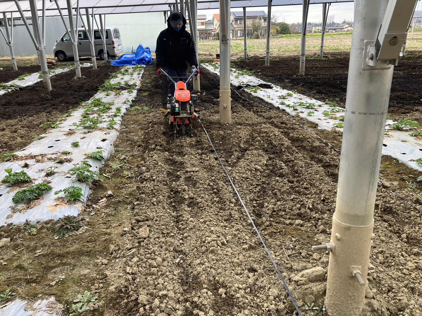 2026-03-17 テ゛ット゛スヘ゜ースの畝立て、マルチ張り 手順1:管理機て゛溝堀り